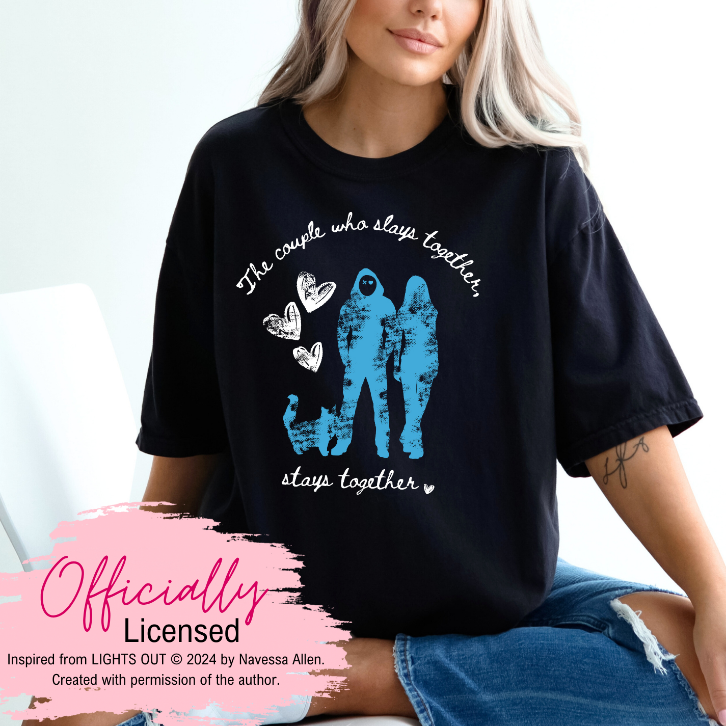 Show your love for Navessa Allen's Lights Out and your favorite masked man with this trendy T-shirt featuring Josh, Aly, and Fred the cat as a family. The shirt includes the phrase "A couple who slays together stays together," making it a fun addition to your wardrobe.